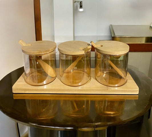 3-Piece Glass Spice Jar Set with Wooden Lids, Spoons & Stand